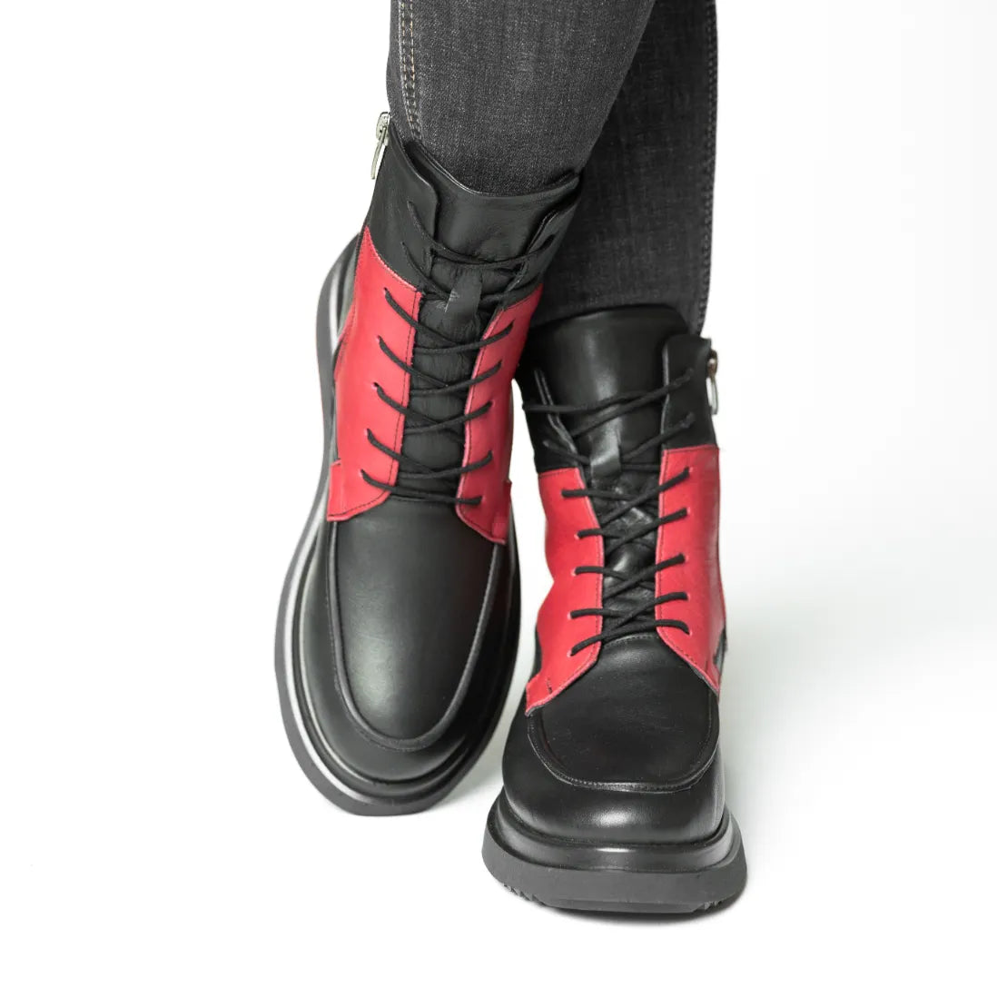 Botine de dama din piele naturala, cu design elegant in nuante de negru si bordo, ideale pentru sezonul rece. Interiorul captusit ofera confort si caldura, in timp ce talpa cu platforma usoara, avand 2.5 cm in fata si 3.5 cm in spate, asigura stabilitate si sustinere optima. Cu o greutate de doar 391g la marimea 38, aceste botine sunt comode si practice pentru purtare zilnica. Perfecte pentru tinute casual sau smart-casual, combina stilul modern cu functionalitatea si durabilitatea.