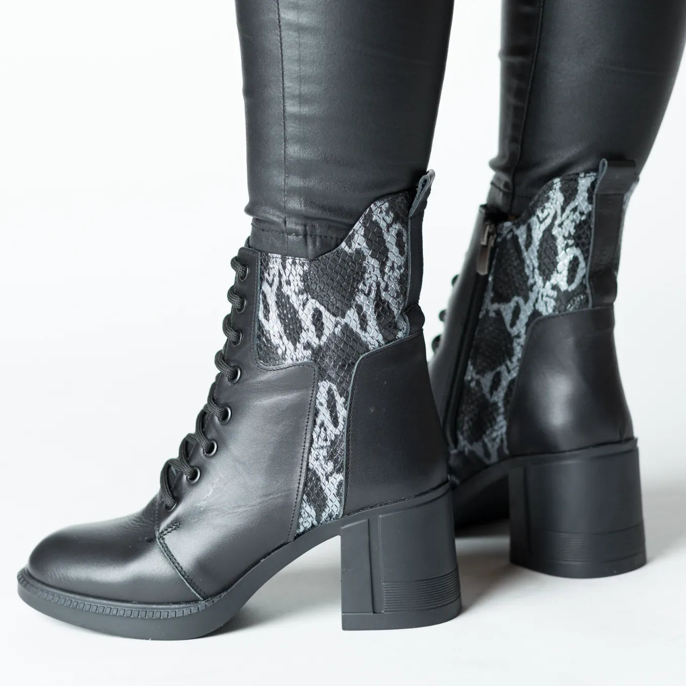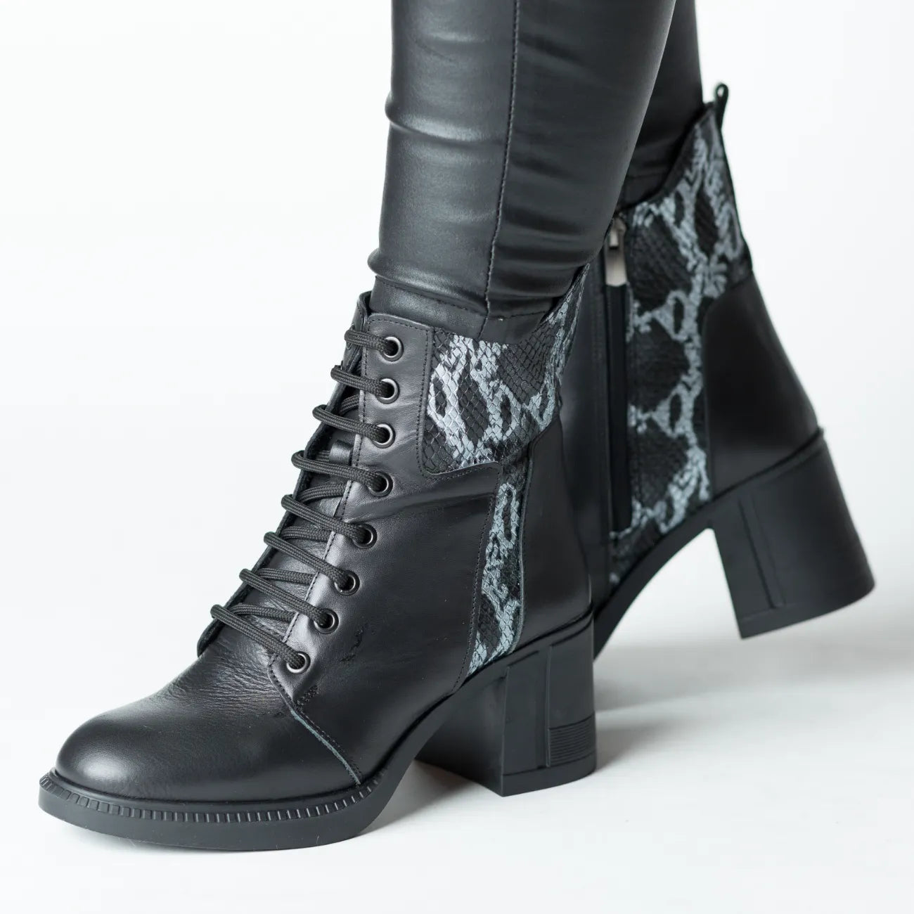 Botine de dama din piele naturala cu aplicatii animal print, care adauga un plus de personalitate si stil oricarei tinute. Interiorul captusit asigura confort si caldura, ideale pentru sezonul rece. Tocul de 7 cm ofera eleganta si sustinere, conturand o silueta feminina si sofisticata. Cu o greutate de doar 445g la marimea 38, aceste botine sunt usoare si comode, perfecte pentru ocazii casual sau elegante. Designul modern si detaliile atent lucrate fac din acest model o alegere versatila si remarcabila.