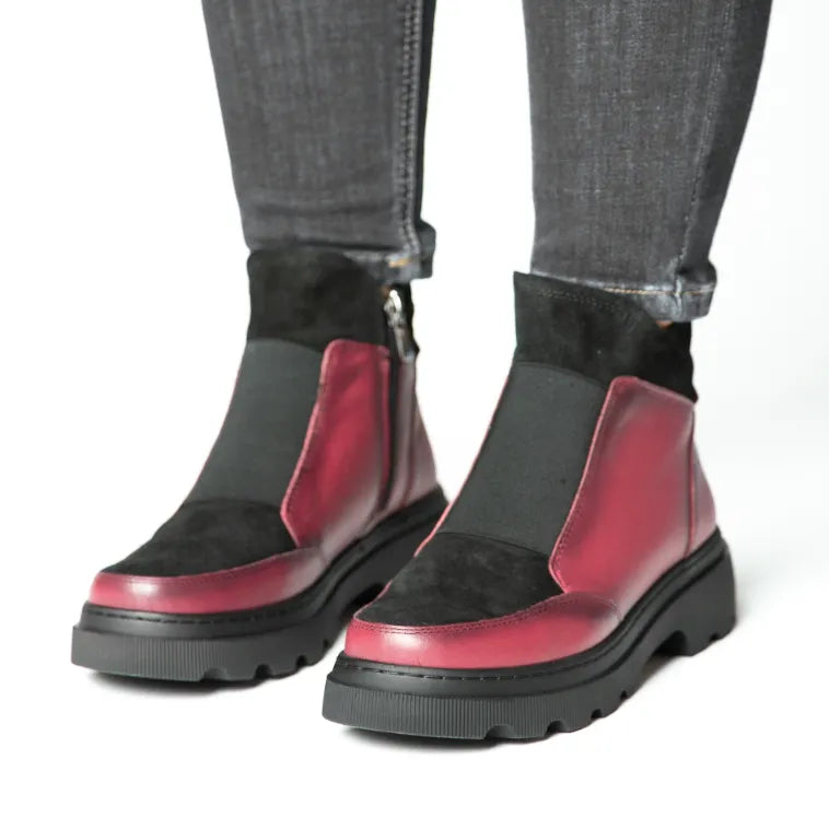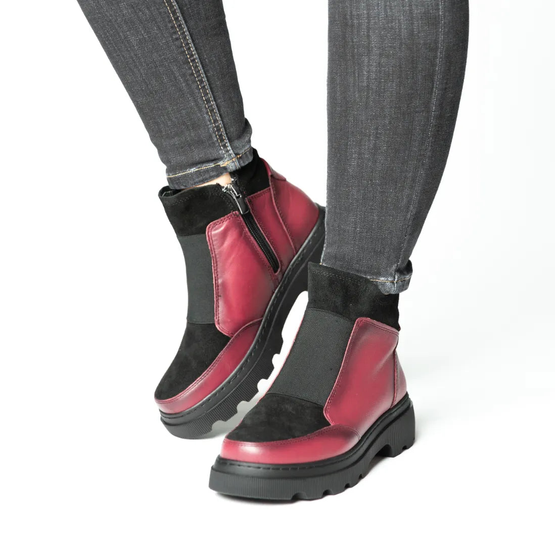 Ghete scurte de dama din piele naturala, cu platforma inalta de 3.5 cm, special create pentru sezonul rece. Modelul Chelsea, in nuanta bordo catifoasa, adauga un aer modern si elegant oricarei tinute. Prevazute cu bareta si inchidere cu scai pentru o fixare rapida si confortabila. Usor de purtat si practice, sunt recomandate pentru zile uscate, oferind stabilitate si sustinere optima. Designul robust si finisajele de calitate transforma aceste ghete intr-o alegere ideala pentru purtarea zilnica in sezonul rece.
