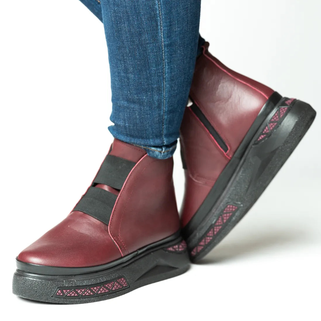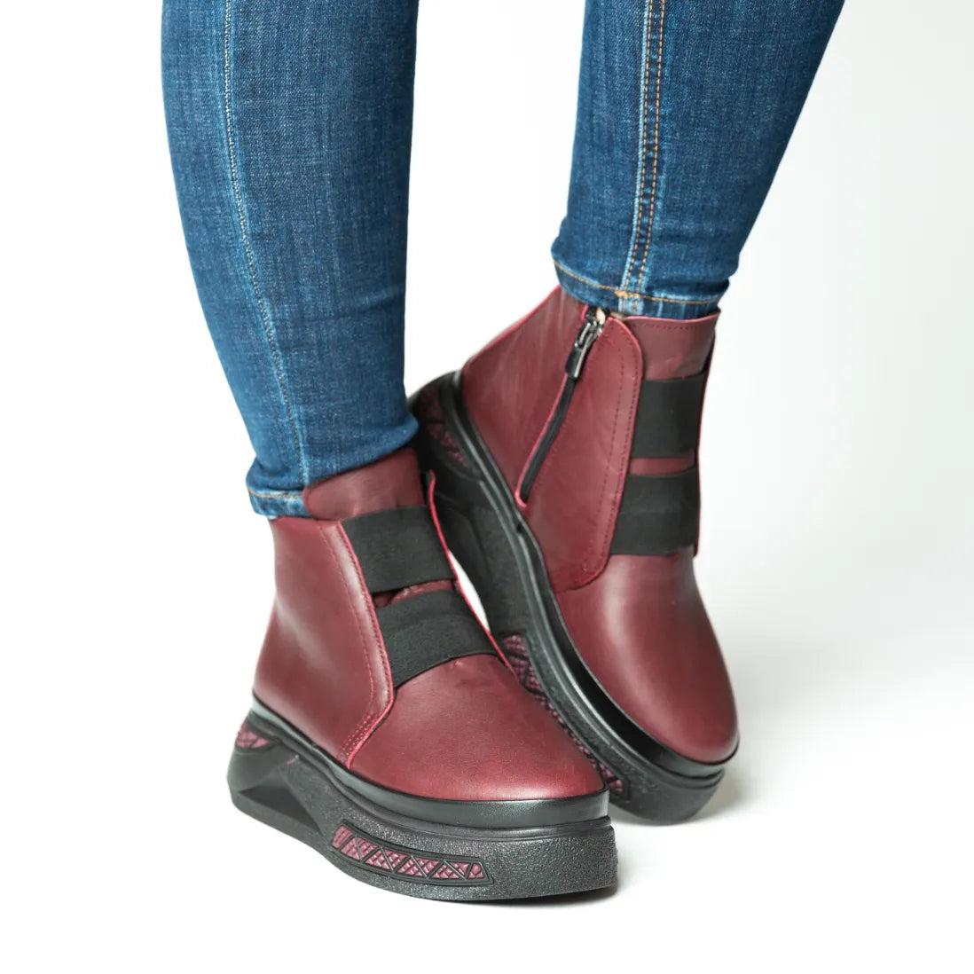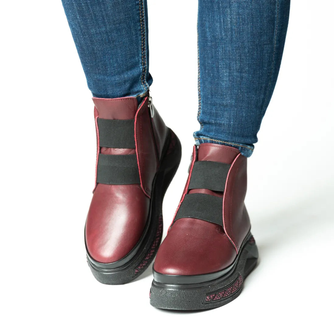 Ghete scurte de dama din piele naturala, cu platforma inalta de 3.5 cm, special create pentru sezonul rece. Modelul Stockholm, in nuanta bordo, adauga un aer modern si elegant oricarei tinute. Prevazute cu bareta si inchidere cu scai pentru o fixare rapida si confortabila. Usor de purtat si practice, sunt recomandate pentru zile uscate, oferind stabilitate si sustinere optima. Designul robust si finisajele de calitate transforma aceste ghete intr-o alegere ideala pentru purtarea zilnica in sezonul rece.