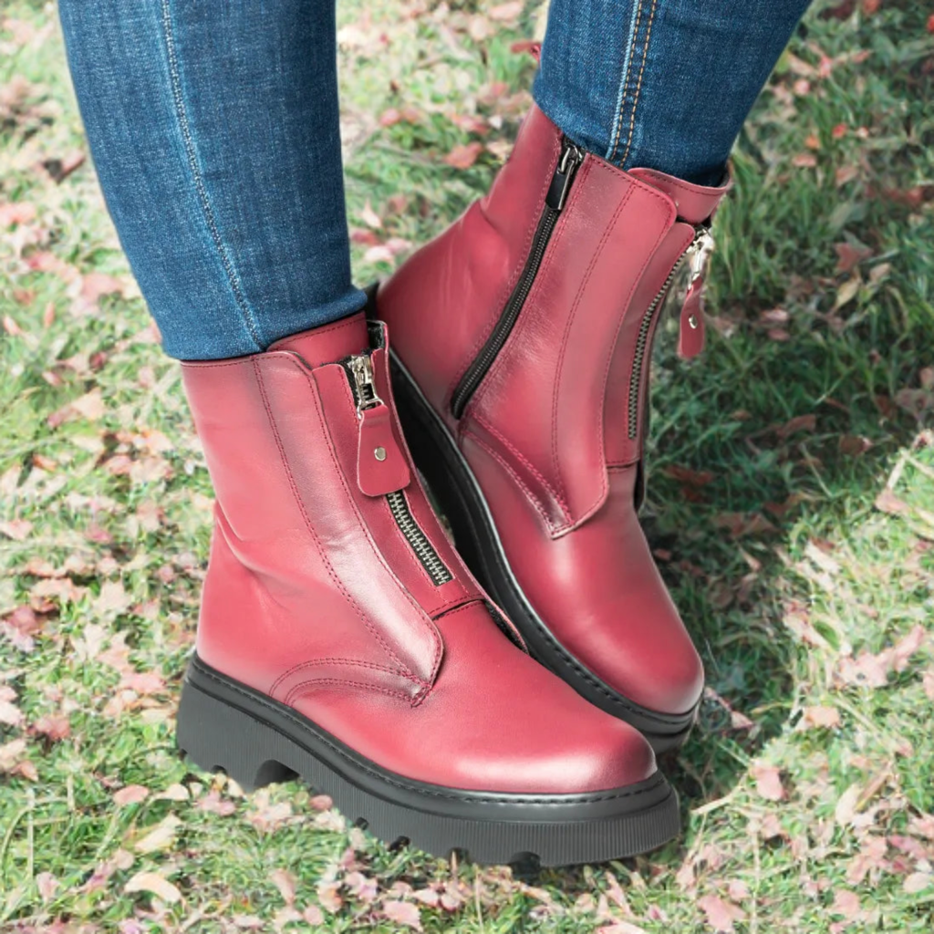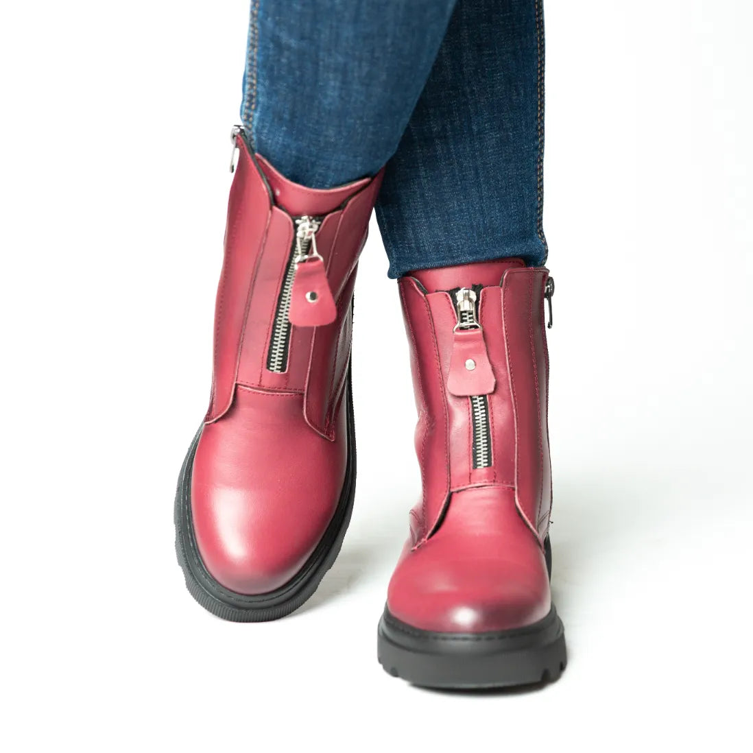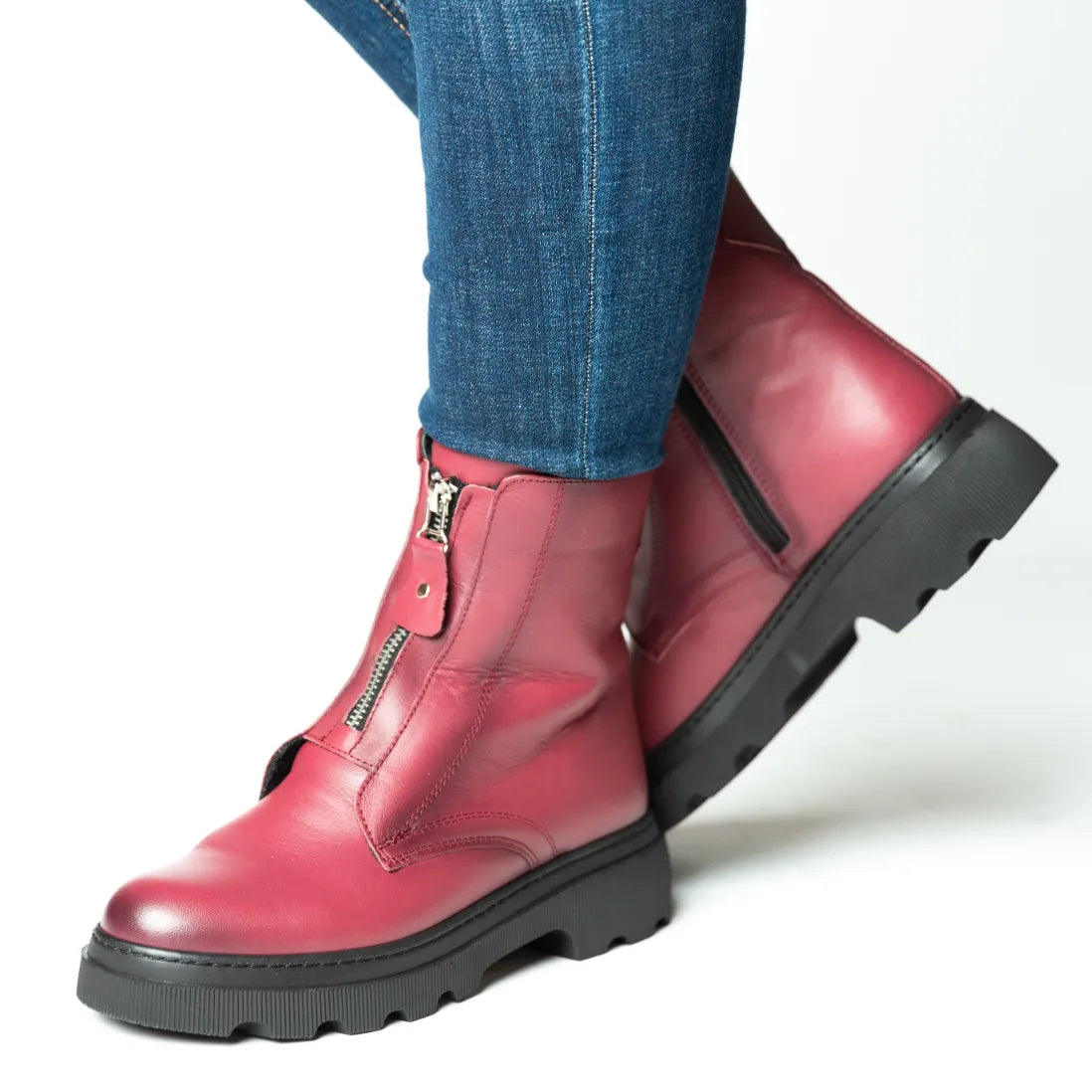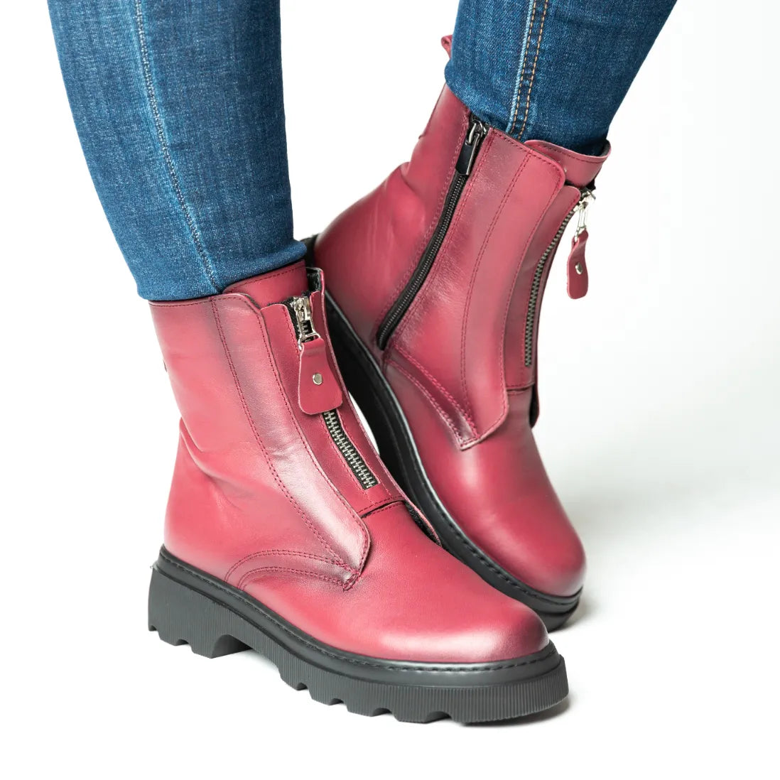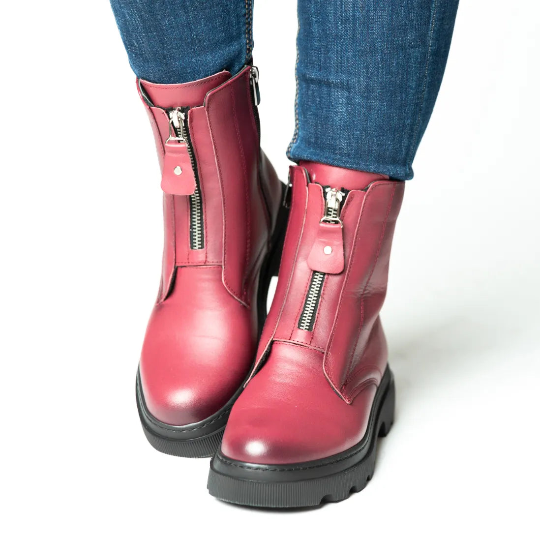 Ghete scurte de dama din piele naturala, cu platforma inalta de 3.5 cm, special create pentru sezonul rece. Modelul Vilnius, in nuanta bordo, adauga un aer modern si elegant oricarei tinute. Prevazute cu bareta si inchidere cu scai pentru o fixare rapida si confortabila. Usor de purtat si practice, sunt recomandate pentru zile uscate, oferind stabilitate si sustinere optima. Designul robust si finisajele de calitate transforma aceste ghete intr-o alegere ideala pentru purtarea zilnica in sezonul rece.