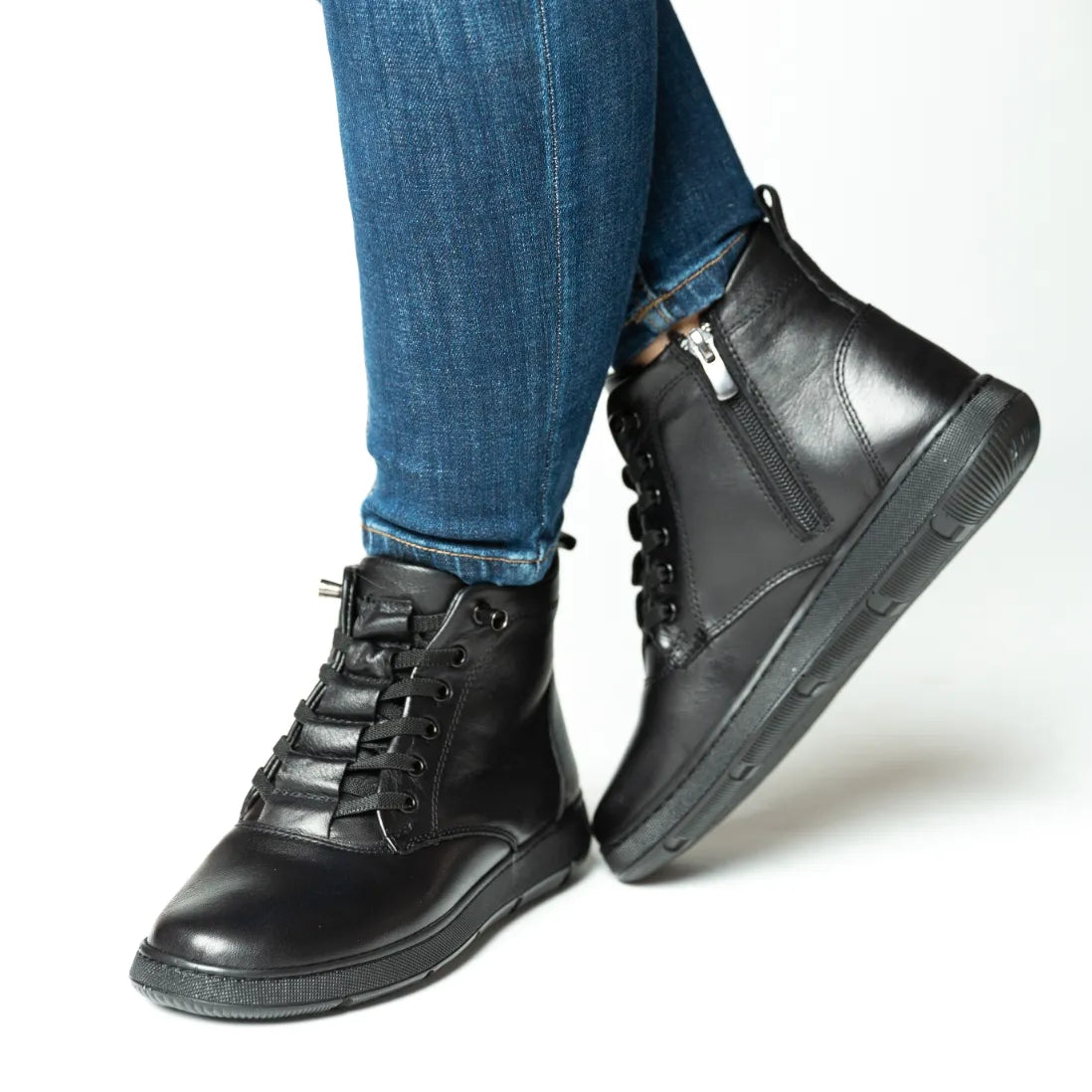 Ghete de dama lucrate pe calapod mare, confectionate din piele naturala de calitate, ideale pentru zilele reci. Interiorul captusit ofera caldura si confort sporit, iar talpa rezistenta, cu inaltime de 3 cm, asigura stabilitate si sustinere. Acest model este usor si comod, perfect pentru purtarea zilnica. Designul practic cu fermoar faciliteaza incaltarea rapida, iar finisajele atent realizate garanteaza durabilitate si eleganta in timp.