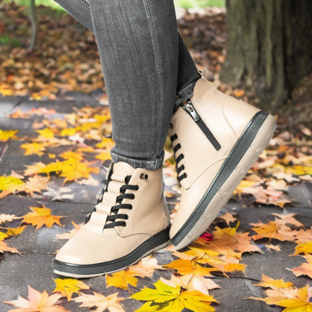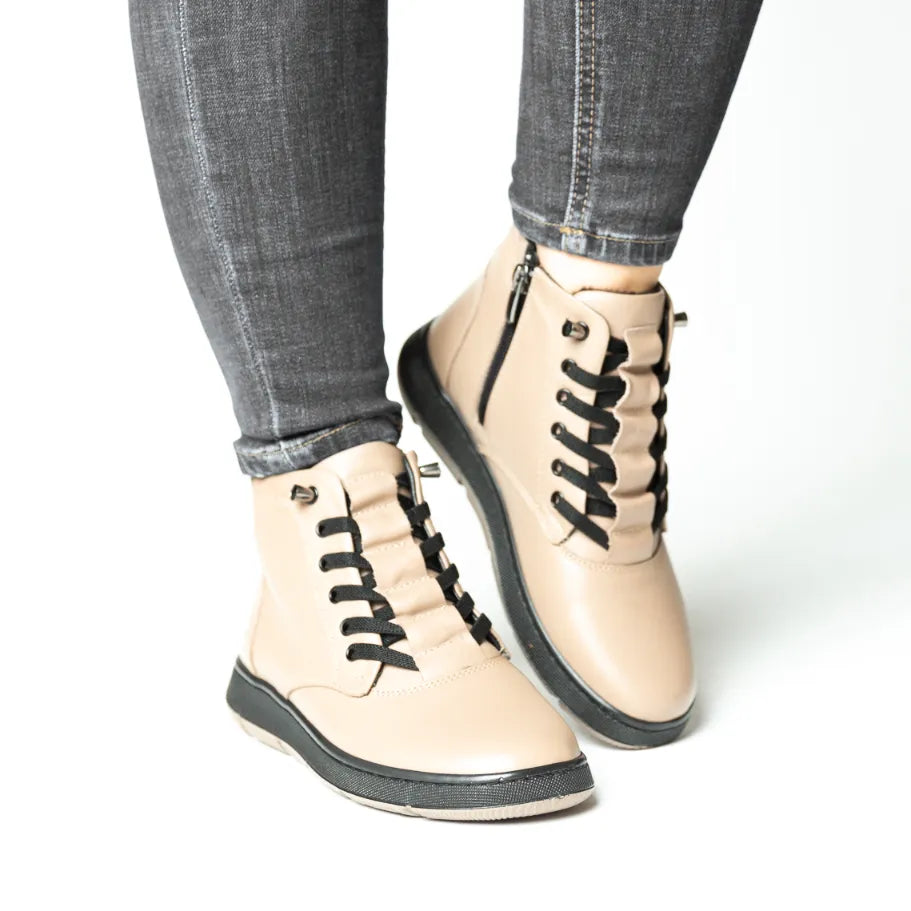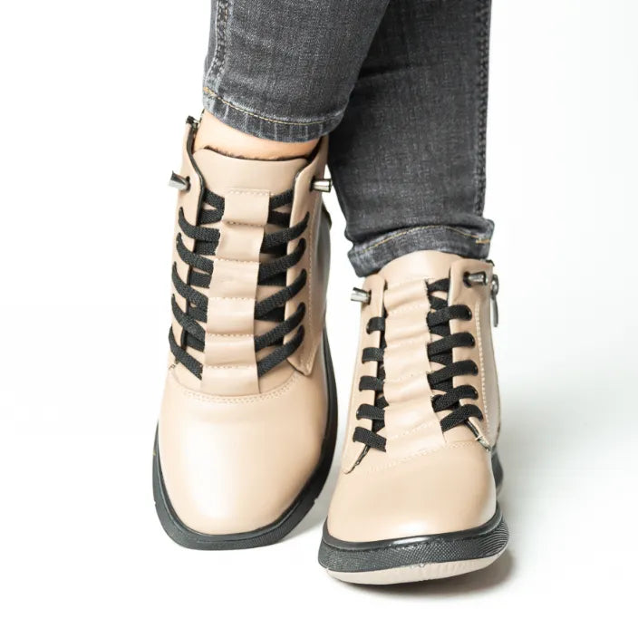Ghete de dama lucrate pe calapod mare, confectionate din piele naturala de calitate, ideale pentru zilele reci. Interiorul captusit ofera caldura si confort sporit, iar talpa rezistenta, cu inaltime de 3 cm, asigura stabilitate si sustinere. Acest model este usor si comod, perfect pentru purtarea zilnica. Designul practic cu fermoar faciliteaza incaltarea rapida, iar finisajele atent realizate garanteaza durabilitate si eleganta in timp.