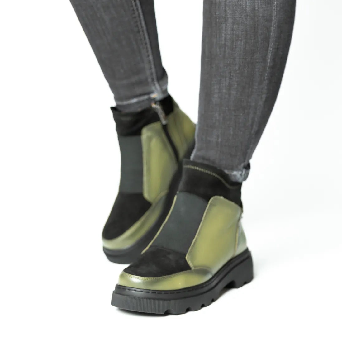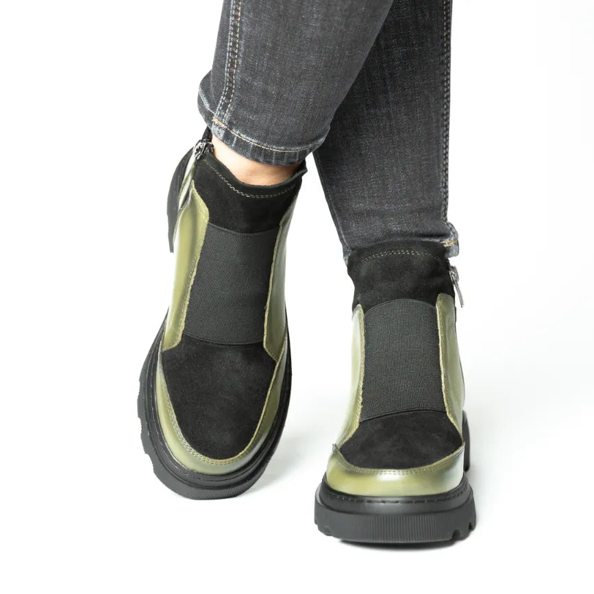 Ghete scurte de dama din piele naturala, cu platforma inalta de 3.5 cm, special create pentru sezonul rece. Modelul Chelsea, in nuanta verde pistachio catifoasa, adauga un aer modern si elegant oricarei tinute. Prevazute cu bareta si inchidere cu scai pentru o fixare rapida si confortabila. Usor de purtat si practice, sunt recomandate pentru zile uscate, oferind stabilitate si sustinere optima. Designul robust si finisajele de calitate transforma aceste ghete intr-o alegere ideala pentru purtarea zilnica in sezonul rece.