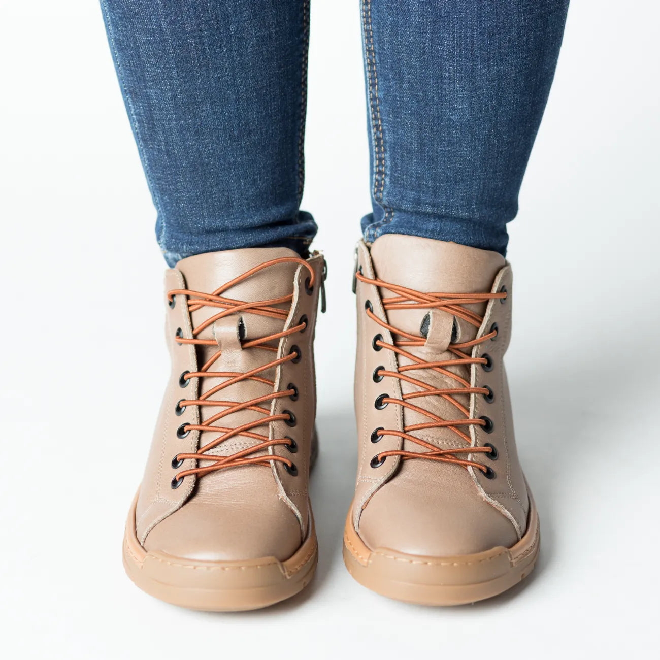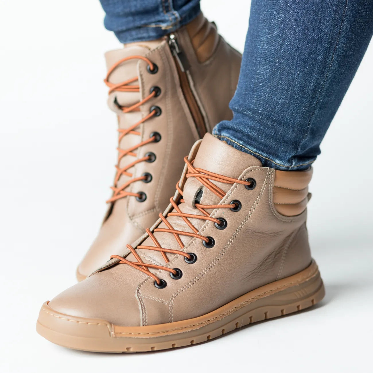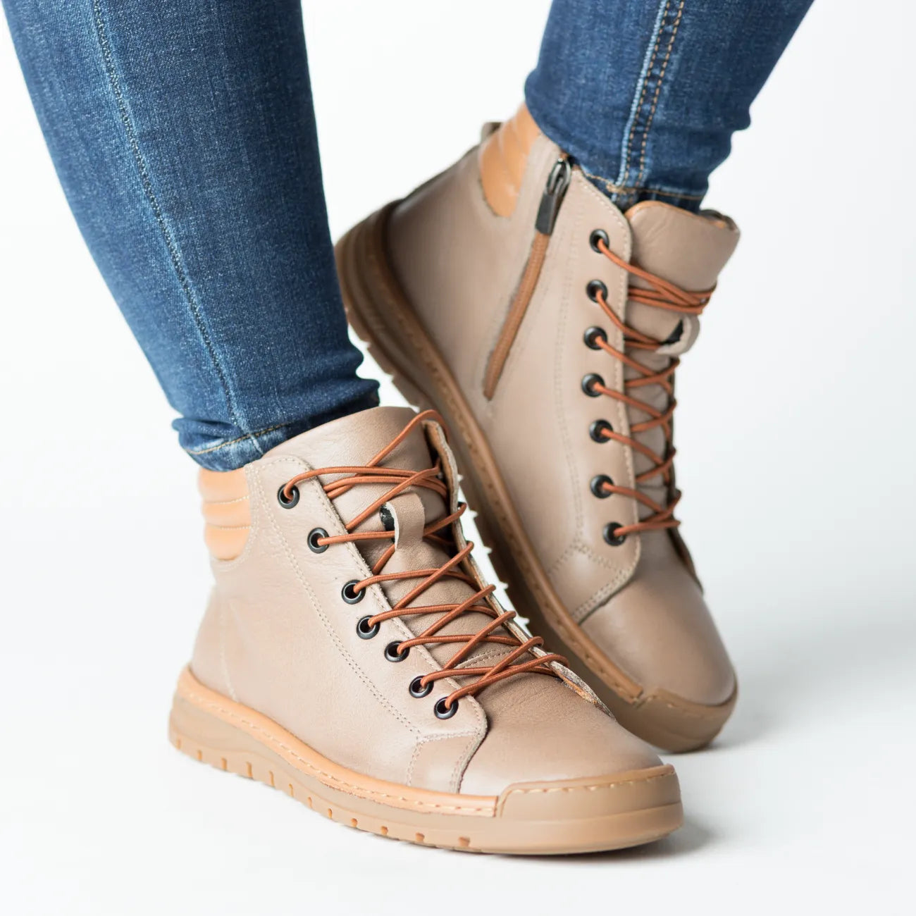 Ghete de dama din piele naturala, cu fermoar la glezna, ideale pentru purtarea de zi cu zi. Modelul combina nuantele bej si maro, oferind un aspect modern si versatil. Interiorul captusit asigura confort si caldura, iar talpa cu platforma de 3.5 cm ofera sustinere si stabilitate pe durata intregii zile. Recomandate pentru un stil casual, aceste ghete sunt fabricate din materiale de inalta calitate si sunt perfecte pentru tinute confortabile si elegante. Se recomanda alegerea marimii uzuale pentru o potrivire perfecta.