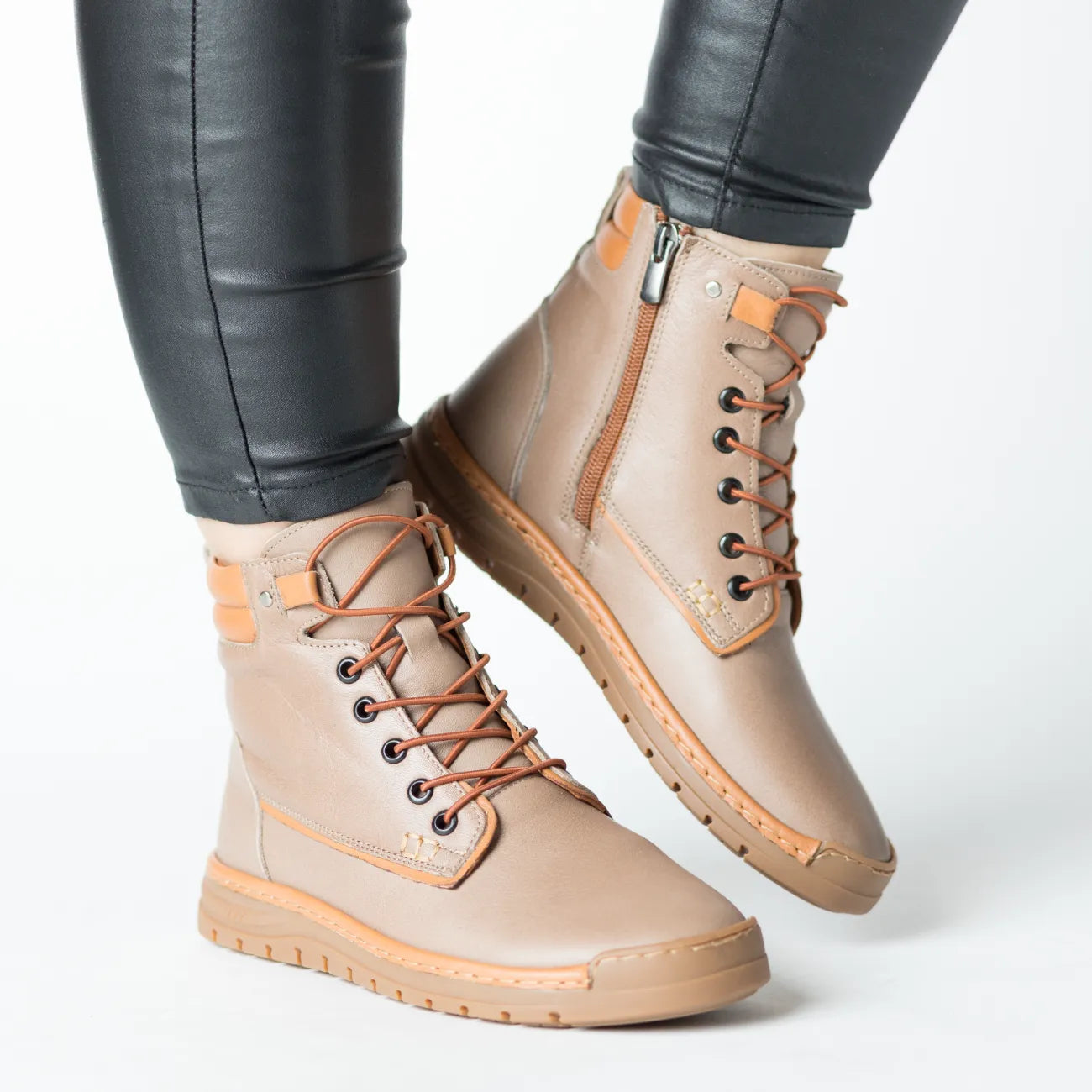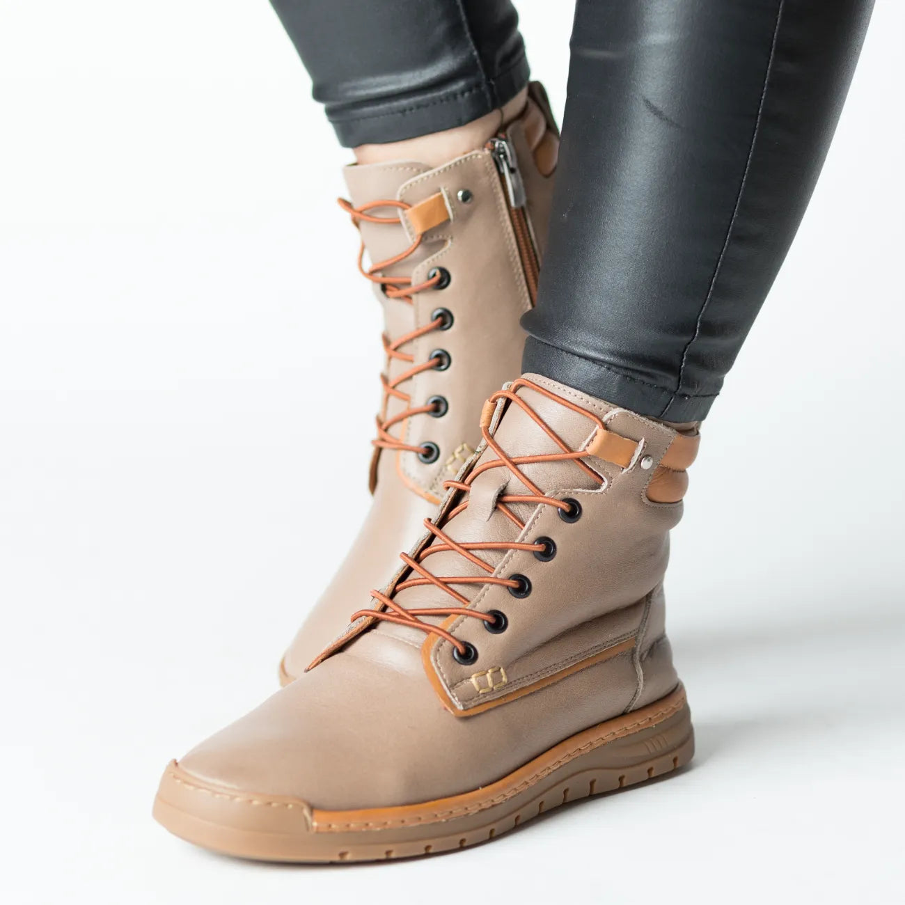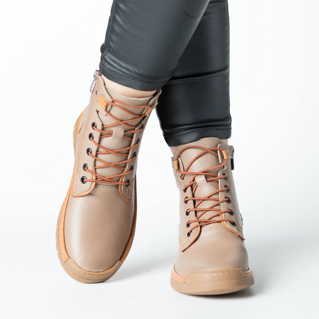 Ghete de dama din piele naturala, prevazute cu fermoar lateral pentru o incaltare rapida si usoara. Interiorul captusit asigura confort si caldura in sezonul rece, iar talpa usoara, cu inaltime de 2 cm in fata si 3 cm in spate, ofera stabilitate si sustinere optima. Cu o greutate de doar 349g la marimea 38, aceste ghete sunt comode si practice, perfecte pentru purtarea zilnica. Designul elegant si finisajele de calitate transforma acest model intr-o alegere versatila, potrivita atat pentru tinute casual, cat si smart-casual.