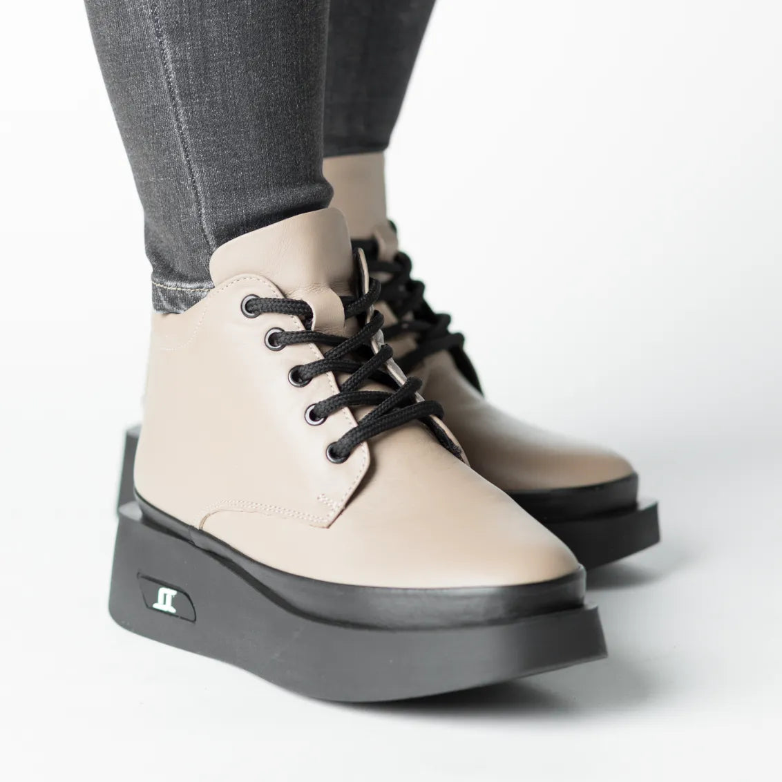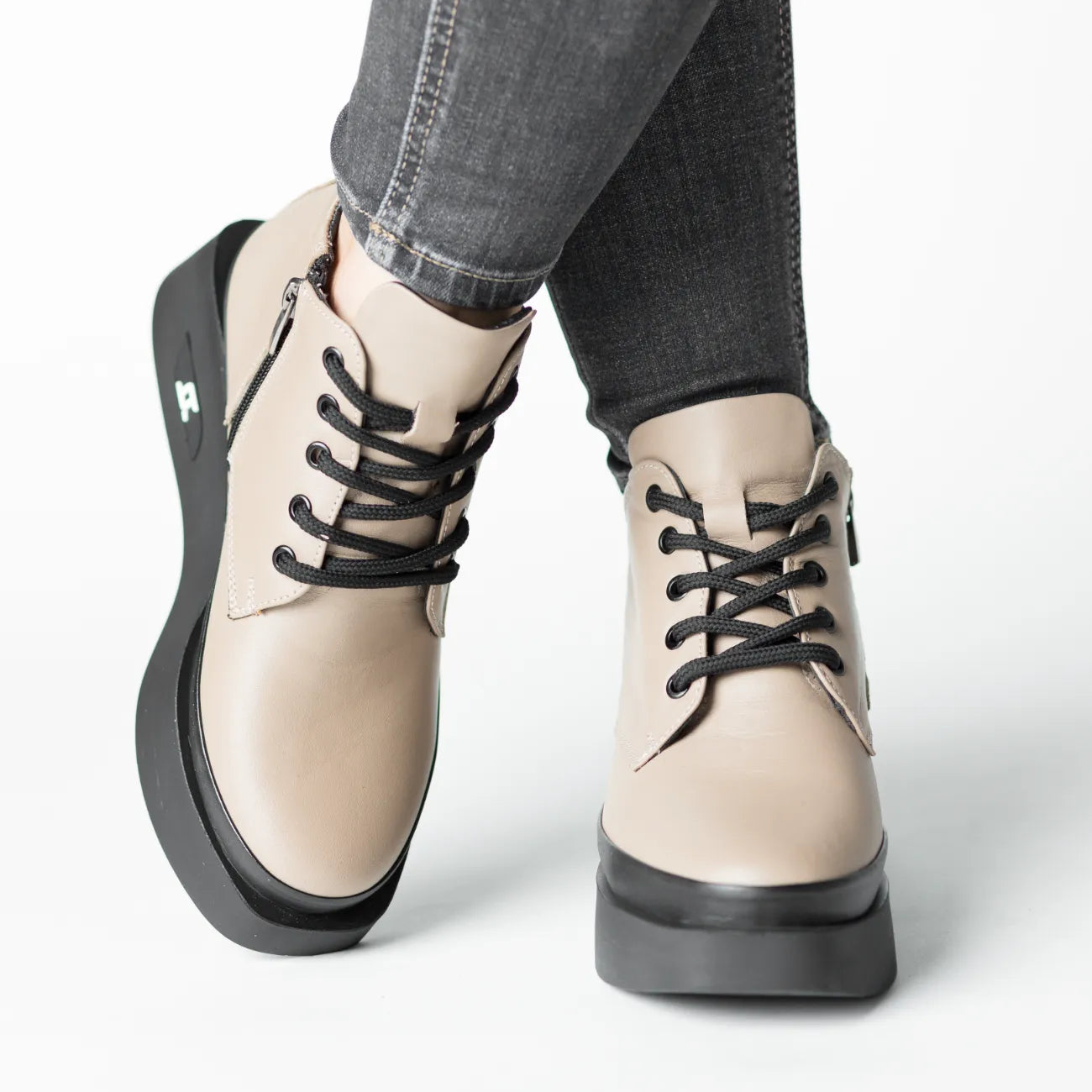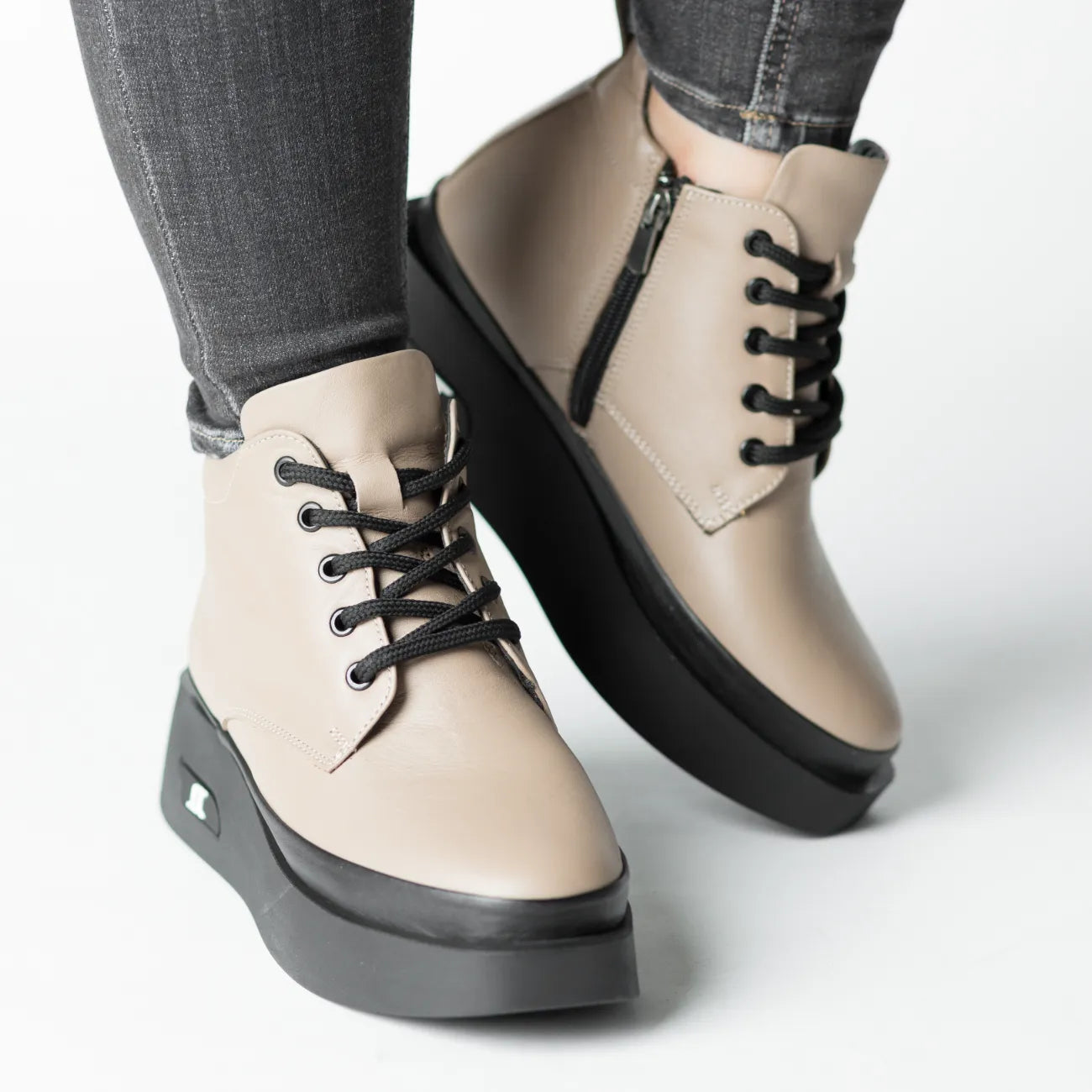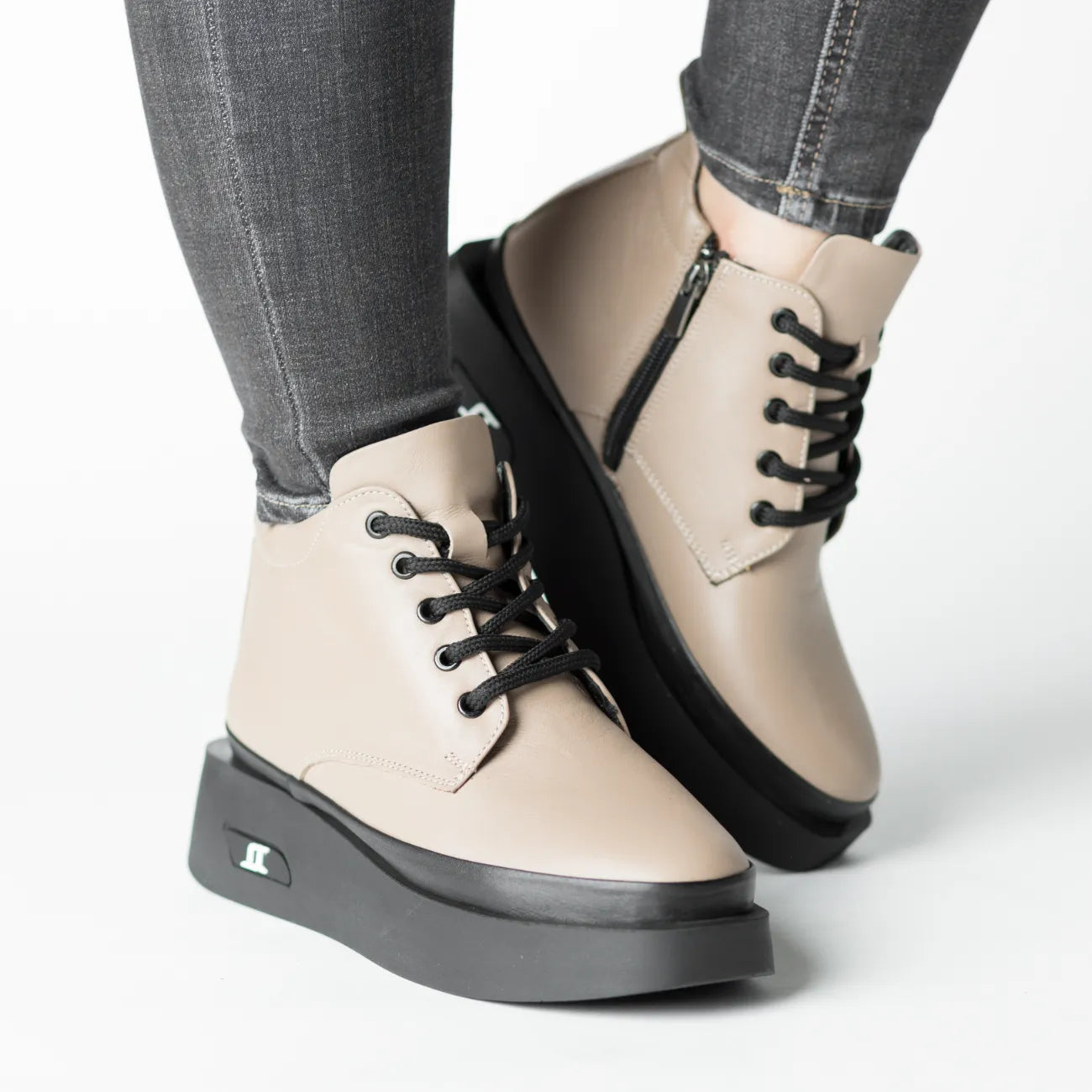 Ghete de dama din piele naturala, ideale pentru sezonul toamna-iarna, cu design practic si confortabil. Modelul bej are varful rotund si inchidere cu fermoar pentru o incaltare usoara si sigura. Interiorul usor izolat combina pielea cu material textil, oferind caldura si confort pe durata intregii zile. Talpa sintetică din cauciuc, cu grosimea platformei de 2,5 cm si toc de 4,5 cm, asigura aderenta si stabilitate chiar si pe suprafete alunecoase. Talpa nu este detasabila, iar constructia solida garanteaza durabilitate si sustinere optima. Un model versatil, perfect pentru tinute casual si smart-casual.