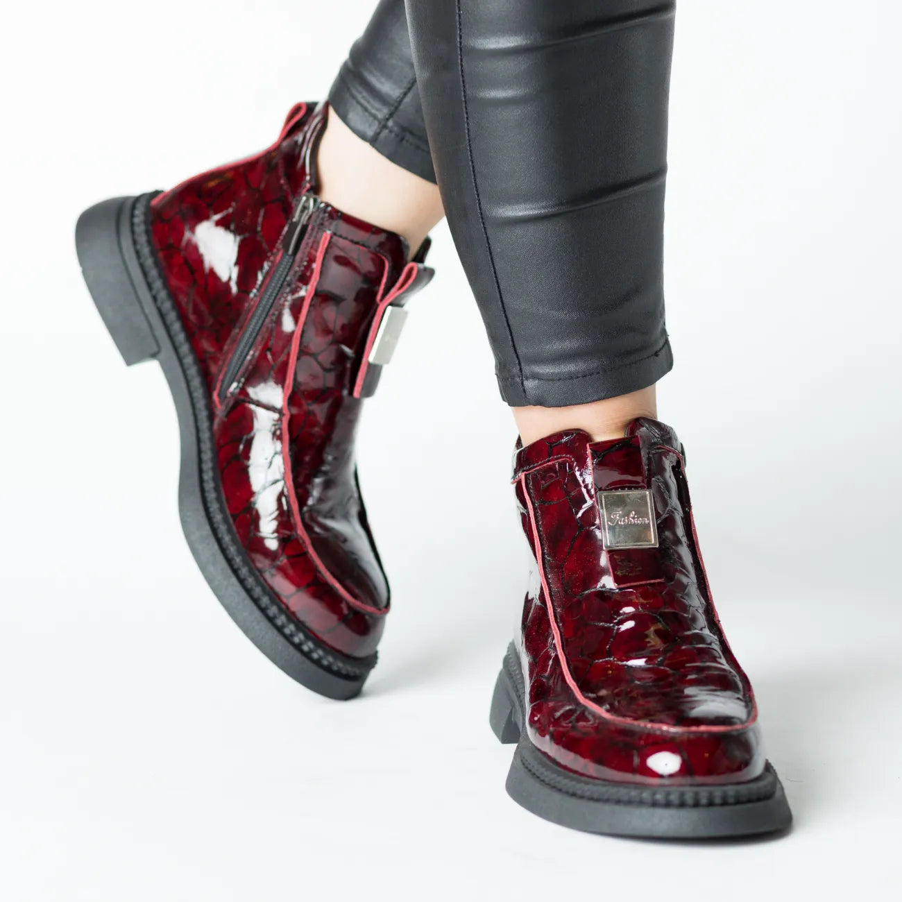 Ghete casual elegante de dama, confectionate din piele naturala lacuita in nuanta bordo lucios, ce adauga un plus de stil si rafinament oricarei tinute. Talpa cu grosimea de 3.5 cm in spate ofera confort si sustinere optima pe parcursul zilei. Inchiderea cu fermoar lateral asigura o incaltare rapida si usoara, pastrand un aspect modern si practic. Aceste ghete sunt perfecte pentru femeile care apreciaza combinatia intre eleganta si confort in tinutele de zi cu zi.