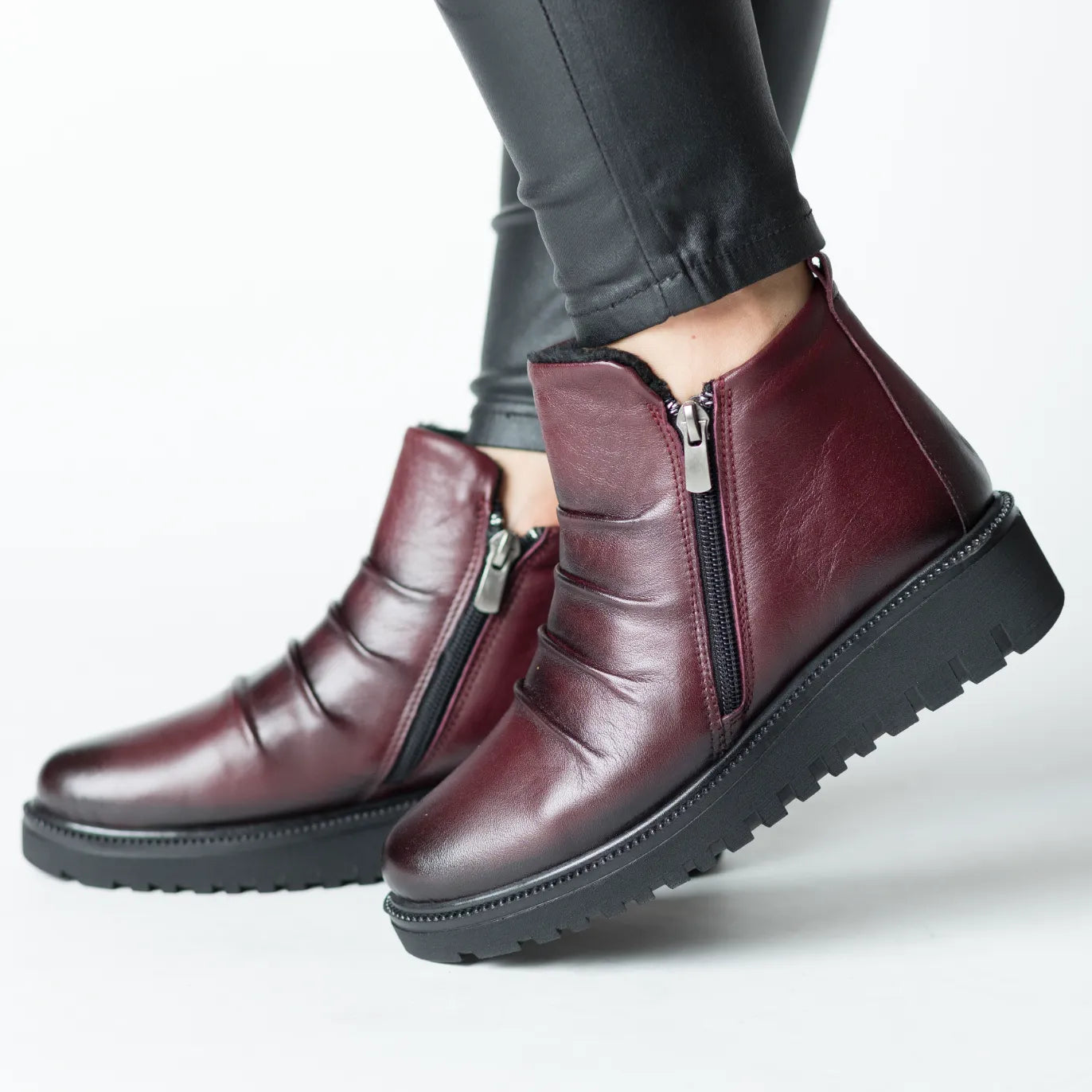 Ghete de dama cu fermoar la glezna, confectionate din piele naturala de calitate superioara. Interiorul captusit ofera confort si caldura, ideale pentru purtarea zilnica in sezonul rece. Talpa usoara, cu inaltime de 2 cm in fata si 4 cm in spate, asigura stabilitate si sustinere la fiecare pas. Cu o greutate de doar 283g la marimea 38, aceste ghete sunt comode si practice, potrivite pentru tinute casual sau smart-casual. Designul modern si finisajele elegante le transforma intr-o alegere versatila si durabila pentru garderoba ta.