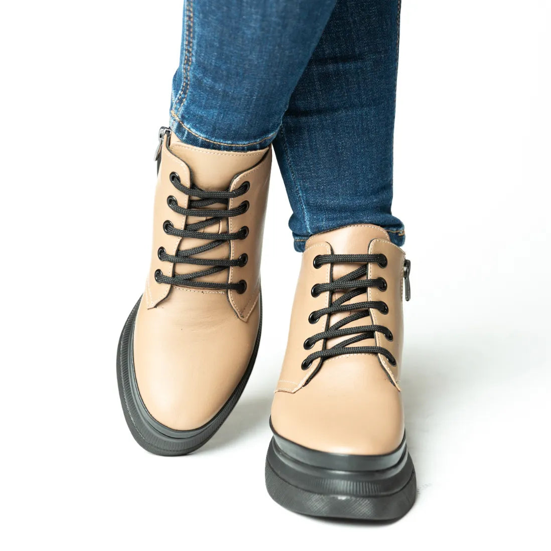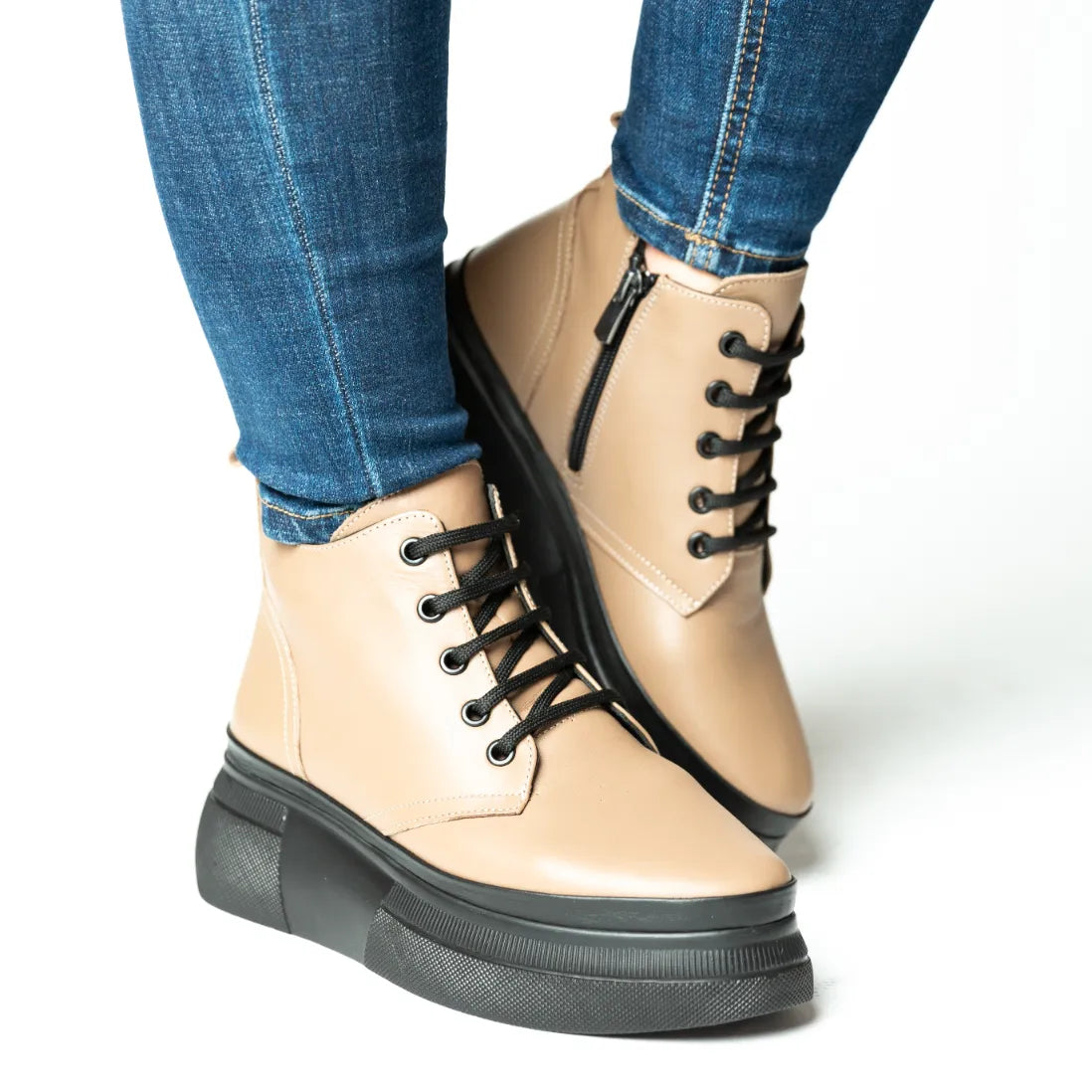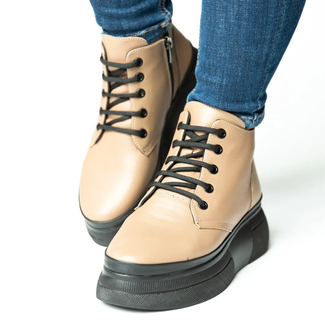 Ghete de dama din piele naturala, lucrate pe calapod mare pentru un confort sporit si o potrivire perfecta. Modelul verde, prevazut cu fermoar si siret, asigura incaltarea usoara si reglarea optima pe picior. Interiorul captusit ofera caldura si confort pe tot parcursul zilei. Talpa robusta, cu inaltime de 3.5 cm in fata si 5.5 cm in spate, asigura stabilitate si sustinere, fiind ideala pentru purtarea zilnica. Cu o greutate redusa de doar 352g la marimea 38, aceste ghete combina calitatea superioara cu functionalitatea si stilul modern.