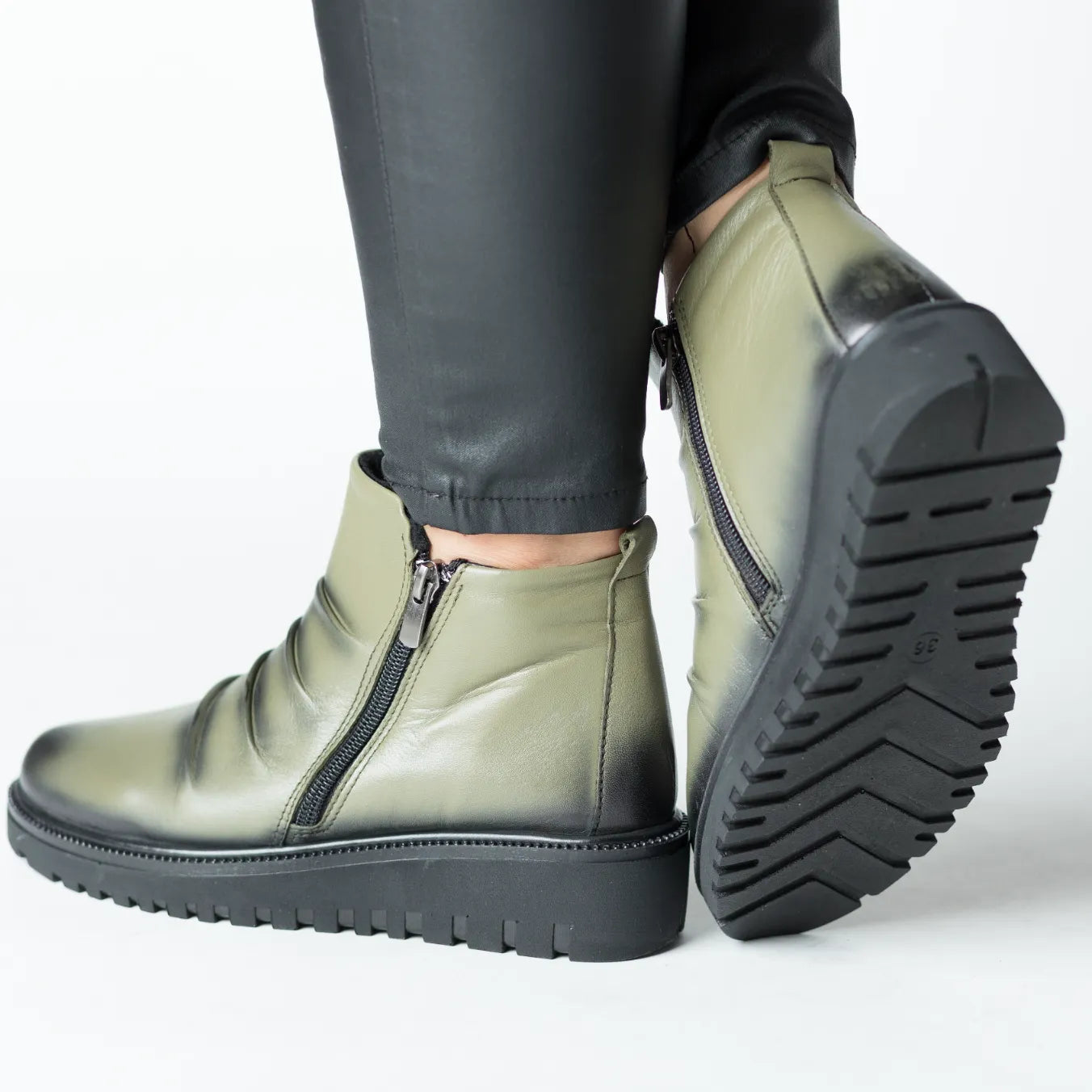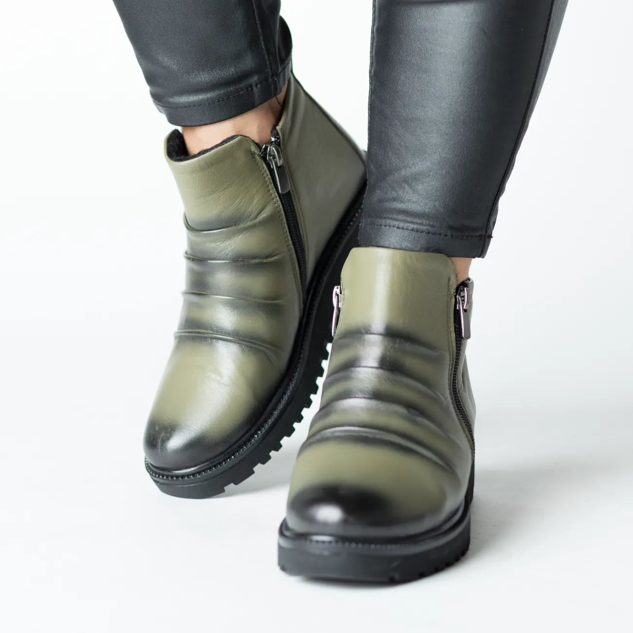 Ghete de dama cu fermoar la glezna, confectionate din piele naturala de calitate superioara. Interiorul captusit ofera confort si caldura, ideale pentru purtarea zilnica in sezonul rece. Talpa usoara, cu inaltime de 2 cm in fata si 4 cm in spate, asigura stabilitate si sustinere la fiecare pas. Cu o greutate de doar 283g la marimea 38, aceste ghete sunt comode si practice, potrivite pentru tinute casual sau smart-casual. Designul modern si finisajele elegante le transforma intr-o alegere versatila si durabila pentru garderoba ta.