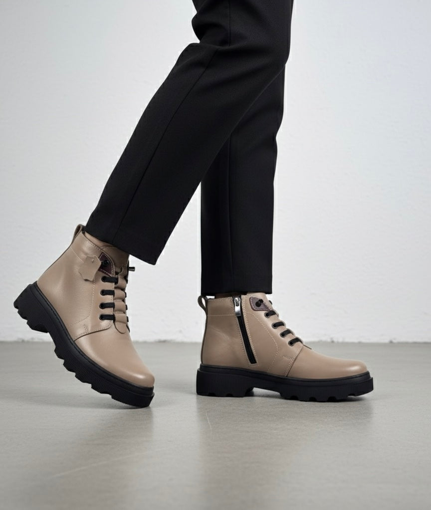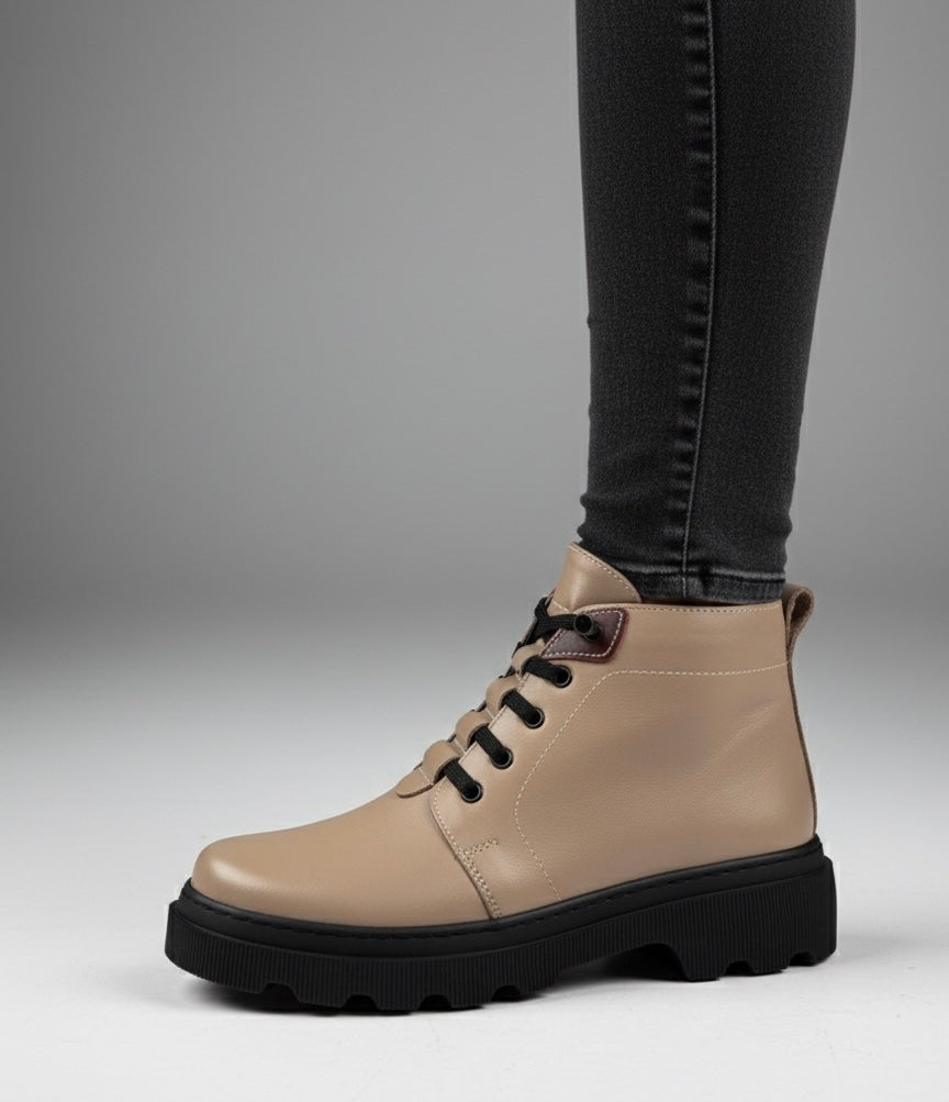 Ghete scurte de dama din piele naturala, cu platforma inalta de 4 cm, special create pentru sezonul rece. Modelul tan, in nuanta camel, adauga un aer modern si elegant oricarei tinute. Prevazute cu bareta si inchidere cu scai pentru o fixare rapida si confortabila. Usor de purtat si practice, sunt recomandate pentru zile uscate, oferind stabilitate si sustinere optima. Designul robust si finisajele de calitate transforma aceste ghete intr-o alegere ideala pentru purtarea zilnica in sezonul rece.