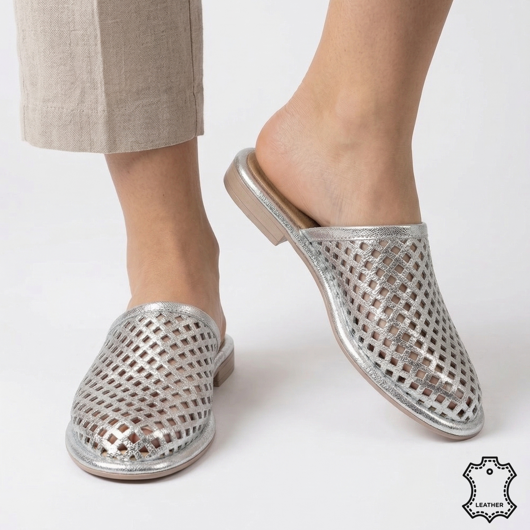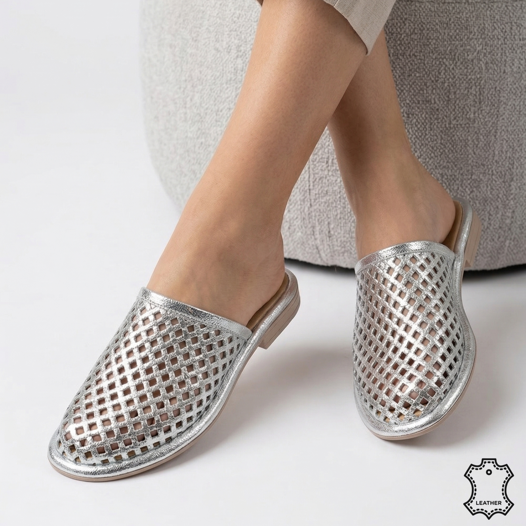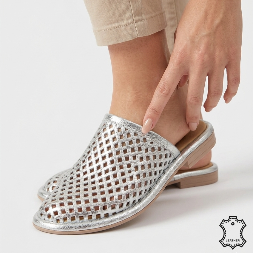 Piele Premium Argintie: Realizați din 100% piele naturală de calitate, acești papuci oferă o textură moale și o reflexie argintie delicată, perfectă pentru zilele însorite sau plimbările de seară.