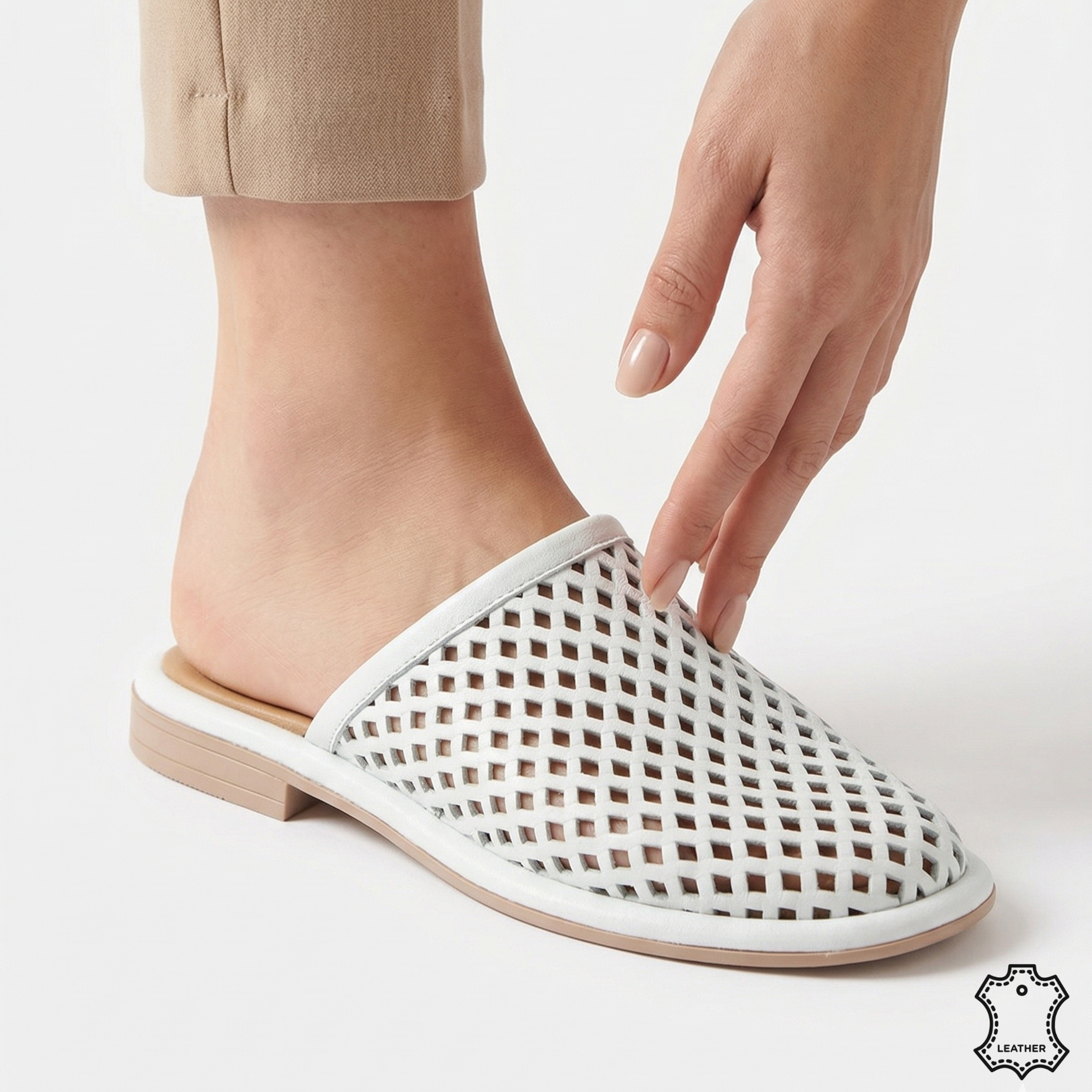 Piele Moale și Respirabilă: Realizați din 100% piele naturală albă, acești papuci permit piciorului să respire liber, menținând o temperatură optimă chiar și în cele mai toride zile.